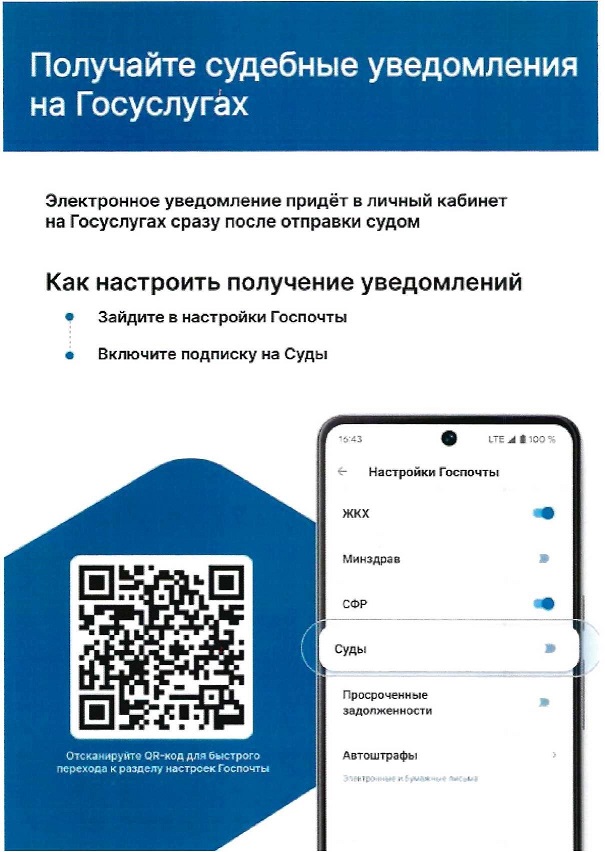 Напоминаем Вам о возможности получения электронной почтовой корреспонденции в сервисе «Госуслуги». Для этого рекомендуем в личном кабинете дать разрешение на получение почтовой корреспонденции с использованием указанного сервиса, а также предоставлять свои ИНН и СНИЛС при подаче какого-либо заявления в суд.